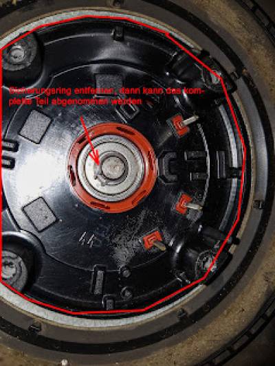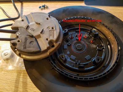 Aan de kant waar het kabeltje erin gaat zit een alu deksel met pakking. Onder dat deksel zit een printje. Wat er uit kan. Letop de transistor zit via een thermisch geleidende pad onder de print dat je die niet beschadigd. Als je het printje er uit hebt zit in het midden een zwart plastic dopje waar een circlips onder zit. Als je die er uit wipt kun je de waaier er af nemen. Wij noemen dit een buiten loper. Het lijkt misschien moeilijk maar stelt niet voor echt 10 minuten werk. Het nummer van het lager staat op de foto