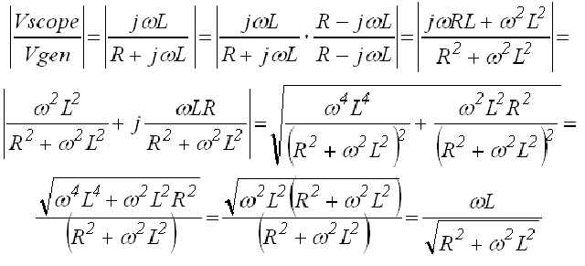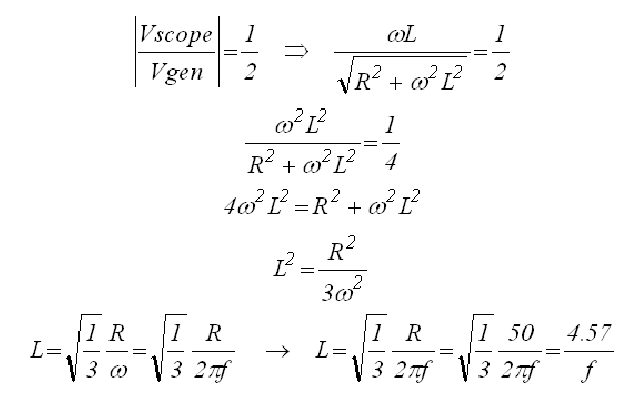 In this formula L represent the inductance, R the resistance, and omega the radial frequency ( = 2*pi*f with f in Hz). The question now is for what frequency (Vscope/Vgen) = 0.5: