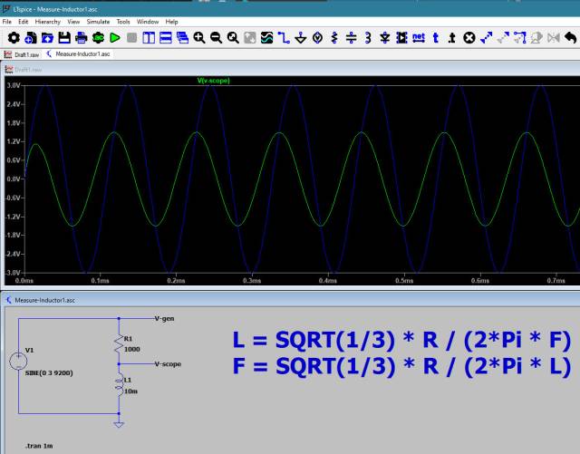Connect the coil with a series resistor to the function generator. Adjust the frequency until the peak-to-peak voltage over the coil is the same as the peak-to-peak voltage over the resistor. In that case “V-scope” is 50% of “V-Gen”.